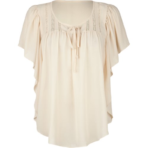 Full Tilt chiffon top. Lightweight and sheer. Loose fit. Scoop neck with center tie. Lace trim at bib. Short batwing sleeves. 100% polyester. Hand wash. Imported.